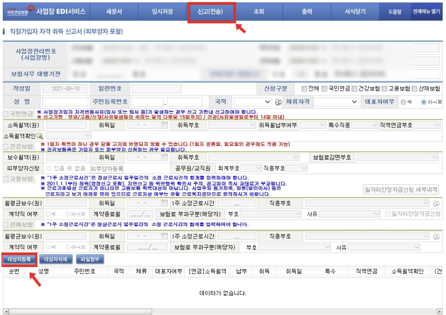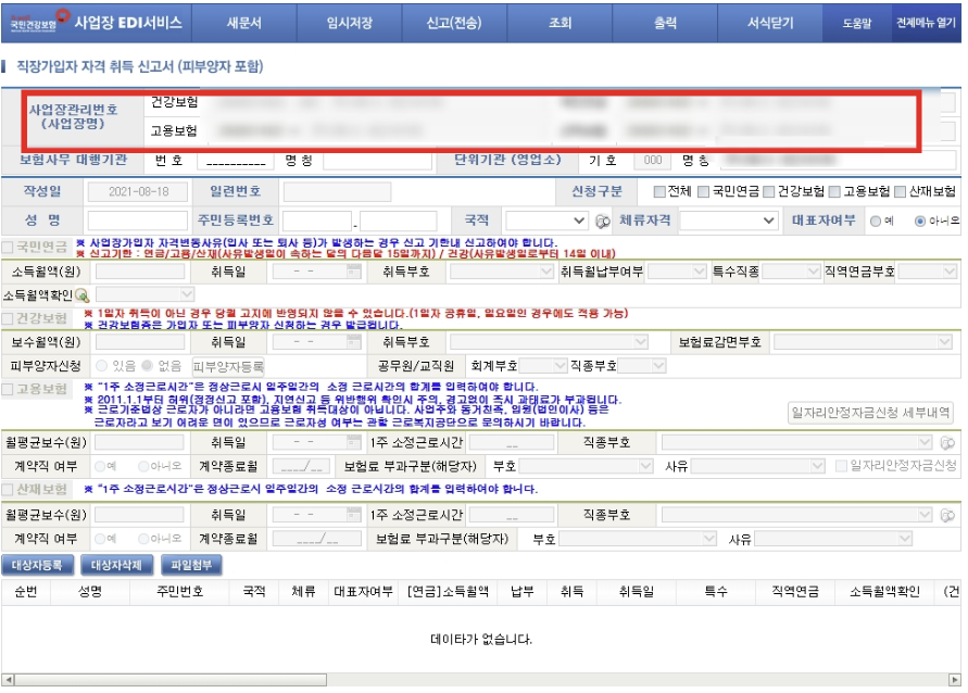 3. 4대보험 관리번호를 확인하신 후 자격취득 신고서를 작성합니다. 사업장을 여러개 관리하는 경우 헷갈리지 않도록 주의하시길 바랍니다.