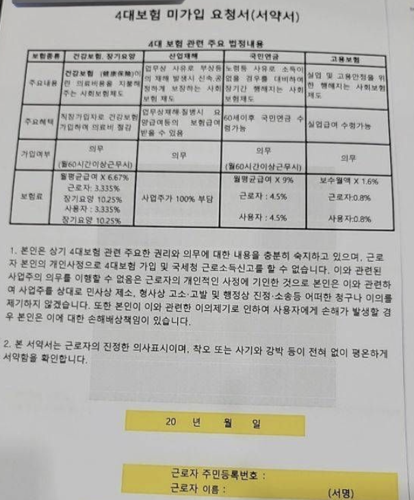 가끔 4대보험 미가입 요청서라면서 아래와 같은 서약서를 통해 4대보험 미가입을 하려는 직원과 회사가 있습니다.