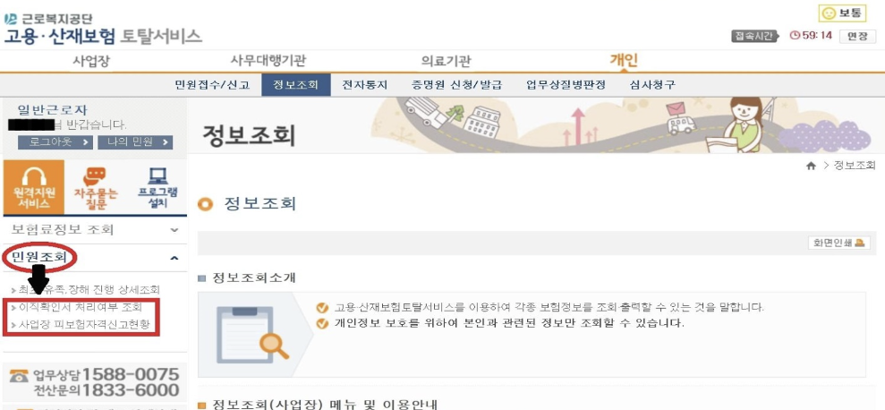 3. [개인] > [정보조회] > [민원조회] > [사업장피보험자격신고현황] 순서대로 클릭합니다.