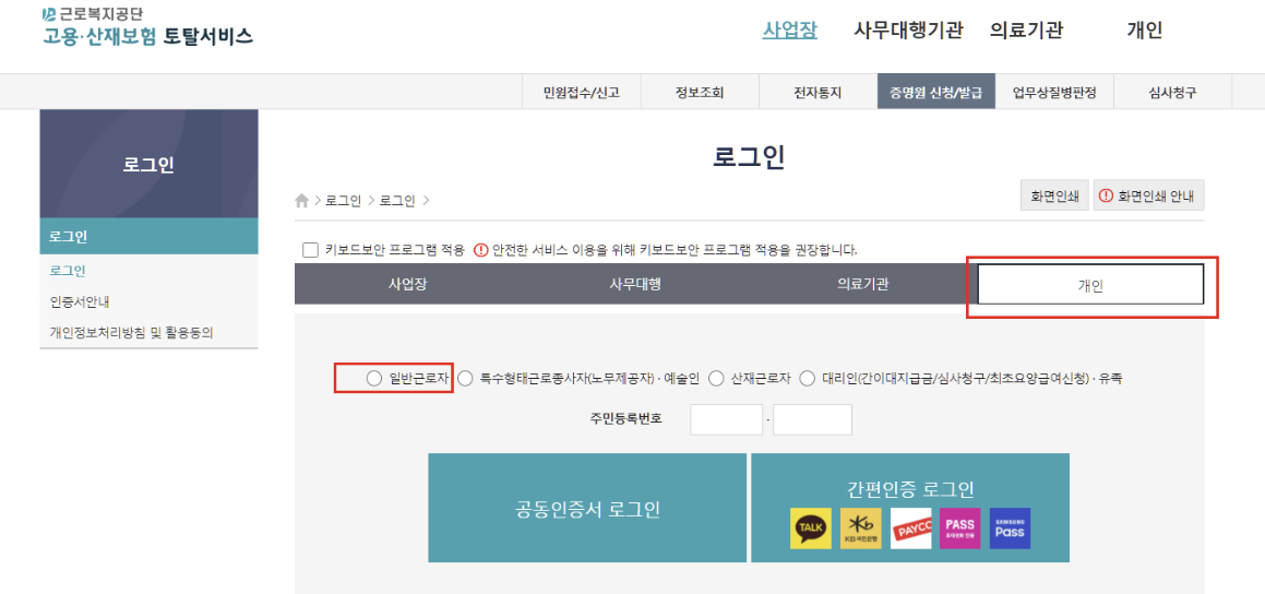 2. 클릭 후에 나타나는 창에서 개인을 눌러 주시고 일반 근로자라면 일반 근로자로 눌러주세요. 다른 직종이시라면 본인 직종에 맞춰 선택해주시면 됩니다.