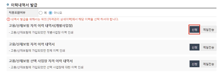 6. 추가로, 고용 보험 가입 이력서 발급의 경우 본인이 원하는 곳만 신청하여 발급이 가능하니 고용보험 가입내역 증명서가 필요하시다면 참고하시길 바랍니다.