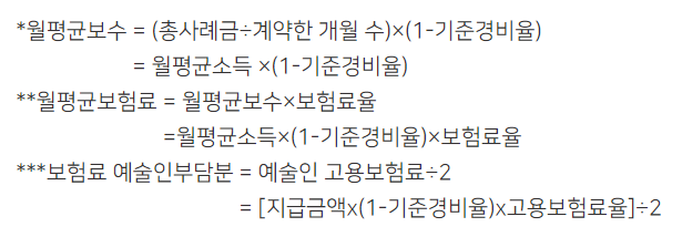 예술인 월평균보수, 월평균보험료, 예술인부담분을 계산하는 공식은 다음과 같습니다.