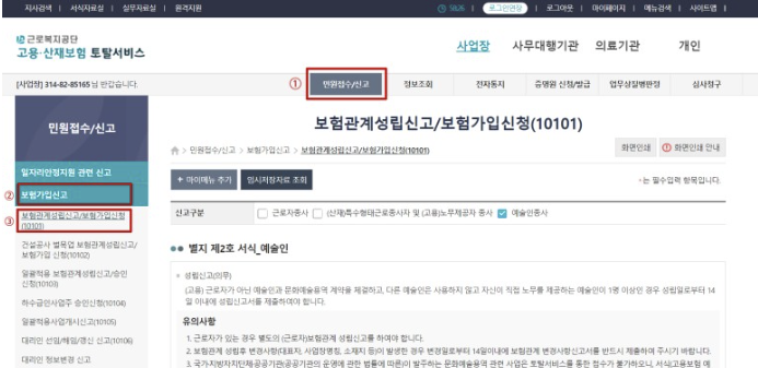2. 사업장으로 회원가입을 한 뒤 [민원접수/신고] > [보험가입신고] > [보험관계성립신고 (10101)] 순서대로 클릭을 해줍니다. 신고구분의 경우 [예술인 종사]로 체크해주시면 됩니다.