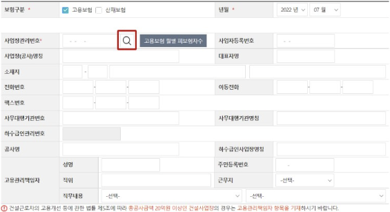 4. [고용보험]에 체크 후 [사업장관리번호] 옆 돋보기를 클릭하여 가입 정보가 입력되어 있는 본인의 사업장을 선택합니다.