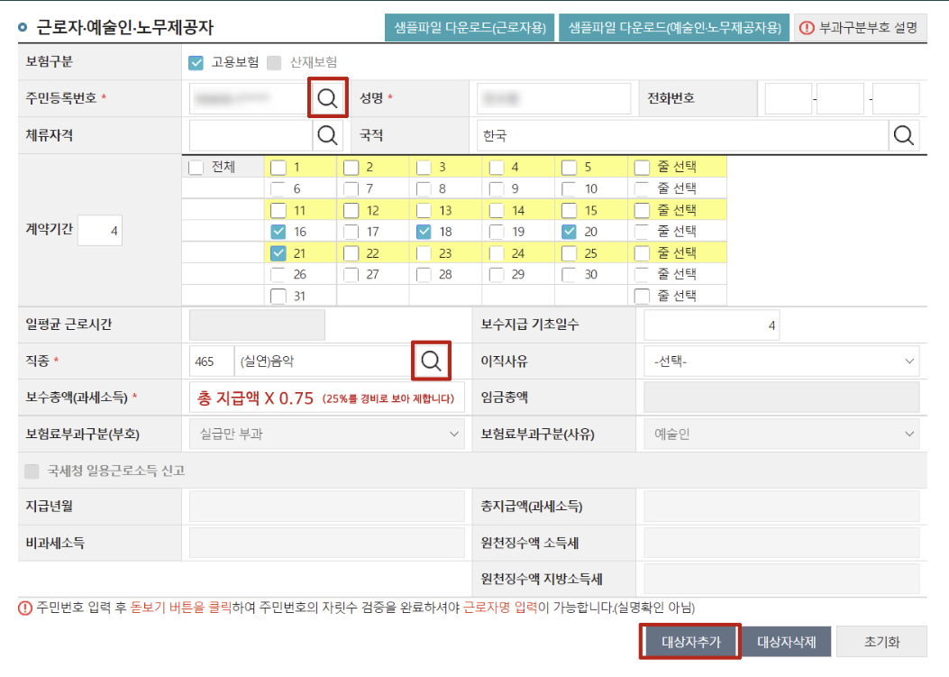 이때 주의하실 점은 예술인고용보험 보수총액신고를 할 때, 보수총액은 총 지급액이 아니라 총 지급액의 75%를 입력해주시면 됩니다. 25%는 필요경비로 인정을 해주기 때문입니다.