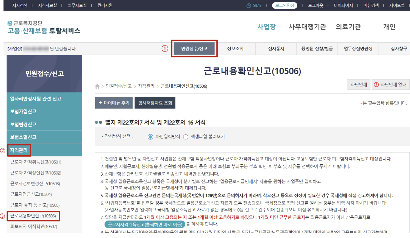 3. [민원접수/신고] > [자격관리] > [근로내용확인신고 (10506)] 순서대로 클릭해줍니다.
