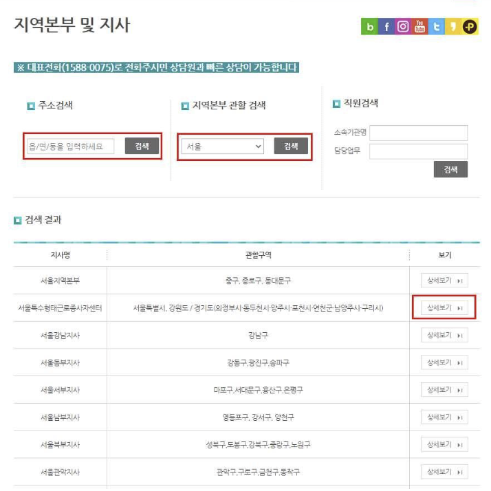 2. 근로복지공단 사이트에서 주소검색을 통해 사업장 주소 관할 특수형태근로종사자센터를 검색합니다. 결과가 나오면 [상세보기]를 클릭합니다.