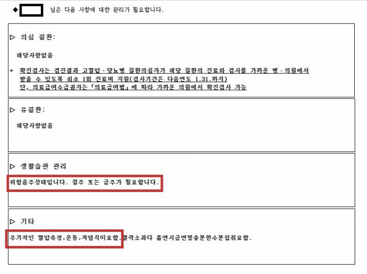 2. 밑으로 내려보면 의심 질환 및 유질환, 생활습관 관리, 기타 내역을 살펴볼 수 있습니다. 그 외에 주기적으로 혈압 측정을 하고 운동과 저염식을 요한다고 적혀 있습니다.