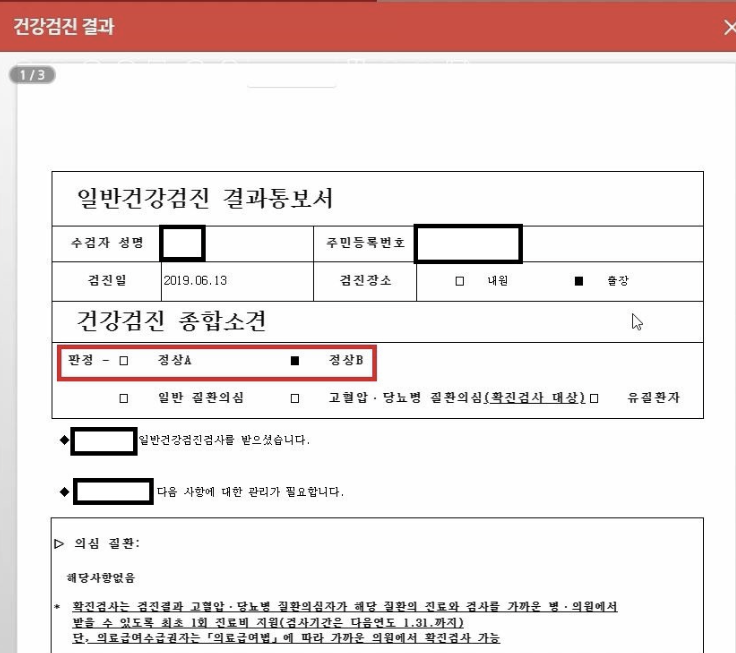 1. 검진결과 상세조회를 들어가보면 먼저 제일 상단에 '건강검진 종합소견'을 보실 수 있습니다. 정상A 또는 정상B 판정이 되어 있는 것을 확인해볼 수 있습니다. 해당 페이지는 총 3페이지로 이루어져 있습니다.