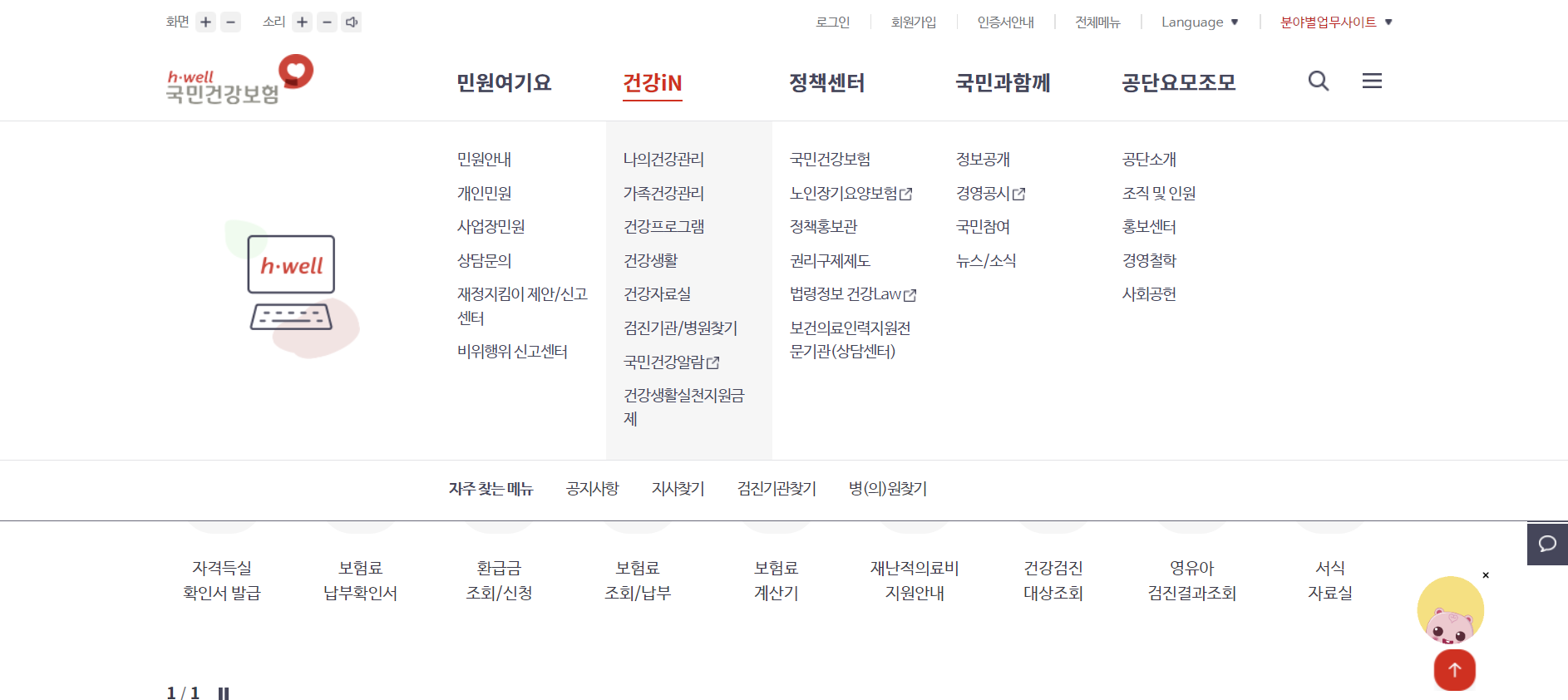 2. 국민 건강보험공단 사이트 상단의 [건강iN] 메뉴를 클릭합니다.
