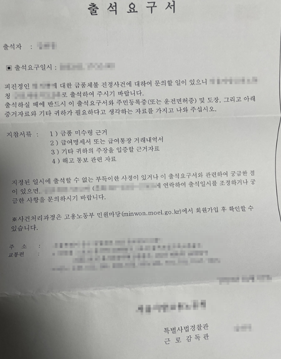 제 앞으로 출석 요구서 등기가 날아왔어요