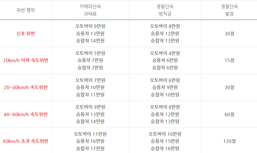 초과속도가 20km/h 이하일 경우 이륜차는 5만원, 승용차는 7만원, 승합차는 7만원이 부과됩니다. 20km/h초과 40km/h 이하일 경우 이륜차 7만원, 승용차 10만원, 승합차 11만원이 부과됩니다.