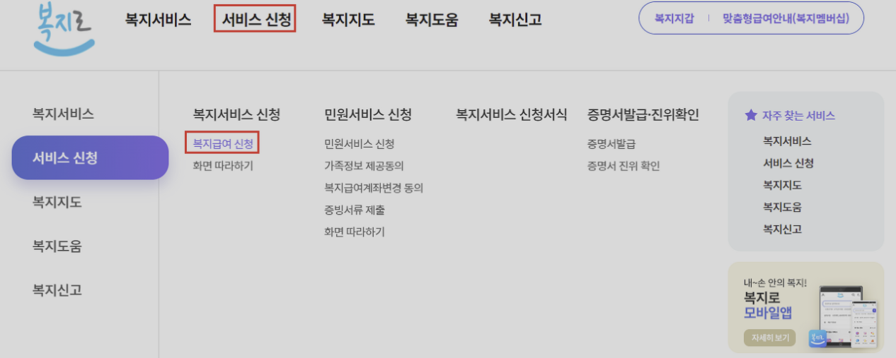 2. 서비스신청 > 복지서비스 신청 > 복지급여 신청 순서대로 클릭합니다.