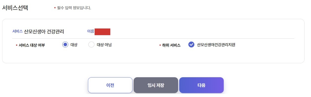 3. 임신출산 > 산모신생아 건강관리 박스에서 '신청하기'를 체크하고, 스크롤을 끝까지 내려 '저장 후 다음단계' 버튼을 누릅니다.