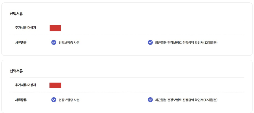 9. 선택서류에서 서류 종류를 선택합니다. 맞벌이 부부인 경우 건강보험증 사본과 최근월분 건강보험료 산정금액 확인서(12개월분) 모두 선택하시면 됩니다.
