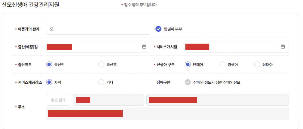 8. 출산 관련 신청정보를 입력합니다. 서비스 개시일은 예정 날짜를 적으면 되는데요, 보통 출산예정일 기준으로 2주 후로 잡으시면 됩니다.