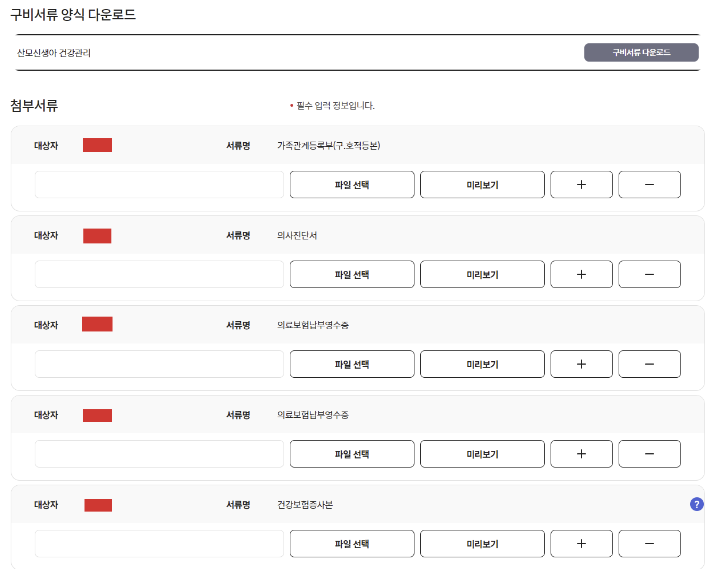 10. 서류를 업로드합니다. 구비서류 다운로드를 누르면 산모신생아 건강관리 신청서 PDF 파일이 다운로드 되니 참고하시길 바랍니다.