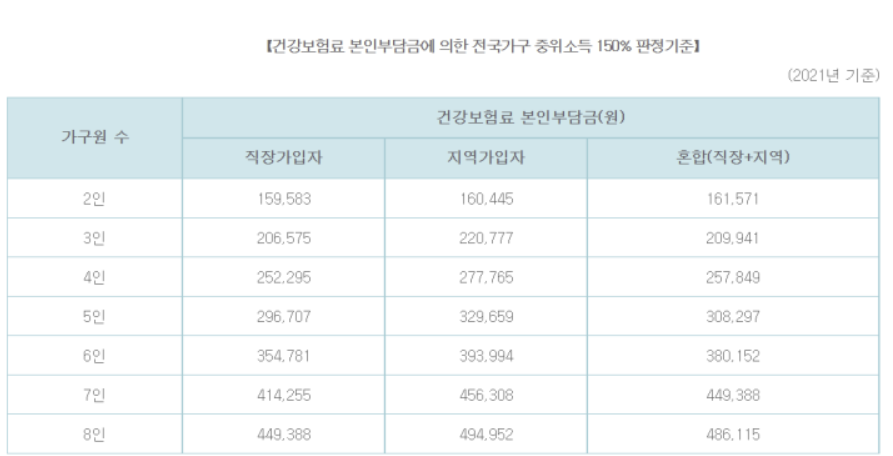 본인이 중위소득 150% 이하에 해당하는 가정인지는 아래 소득표를 참고하시길 바랍니다.