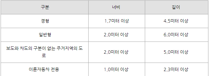 그리고 평행주차형식 외의 경우 경헝은 너비 2미터 이상 길이 3.6미터 이상, 일반형은 너비 2.5미터 이상 길이 5미터 이상입니다.