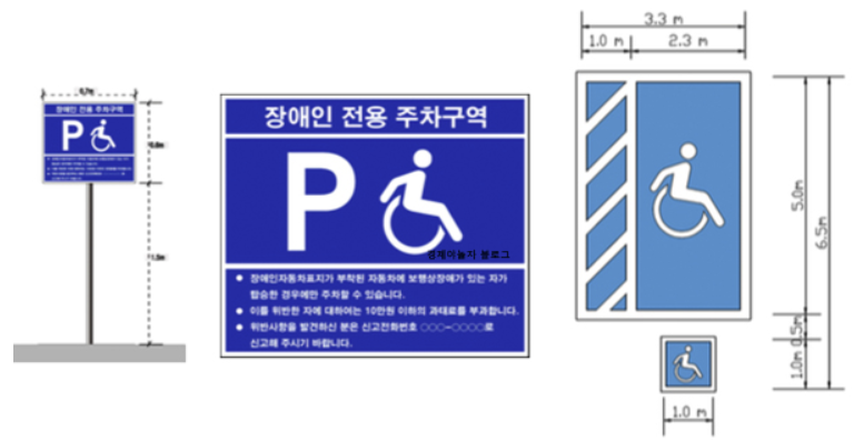 1. 장애인 전용 주차구역은 최소한 폭 3.3m 이상, 길이 5m 이상이 확보하여야 합니다.