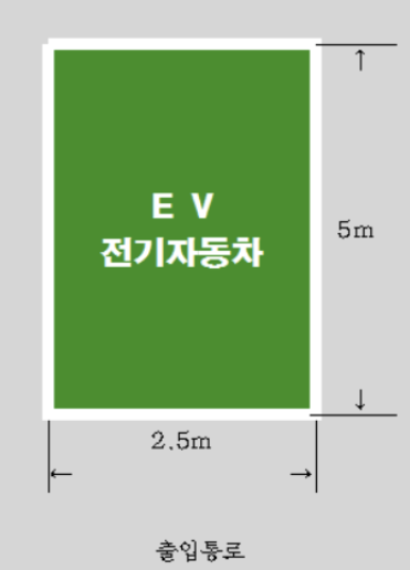 전기자동차 주차규격은 아직도 '가로 2.3m이상×세로 5m이상' 이라고 표현되어 있습니다. 하지만 상위법인 '주차장법 시행규칙'에 명시되어 있듯이 일반주차 규격은 '가로 2.5m이상x세로 5m이상'으로 2018년 3월에 개정되었습니다. 즉, 전기주차 규격은 '가로 2.5m이상x세로 5m이상'으로 계획되어야 합니다.