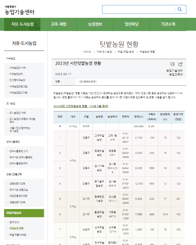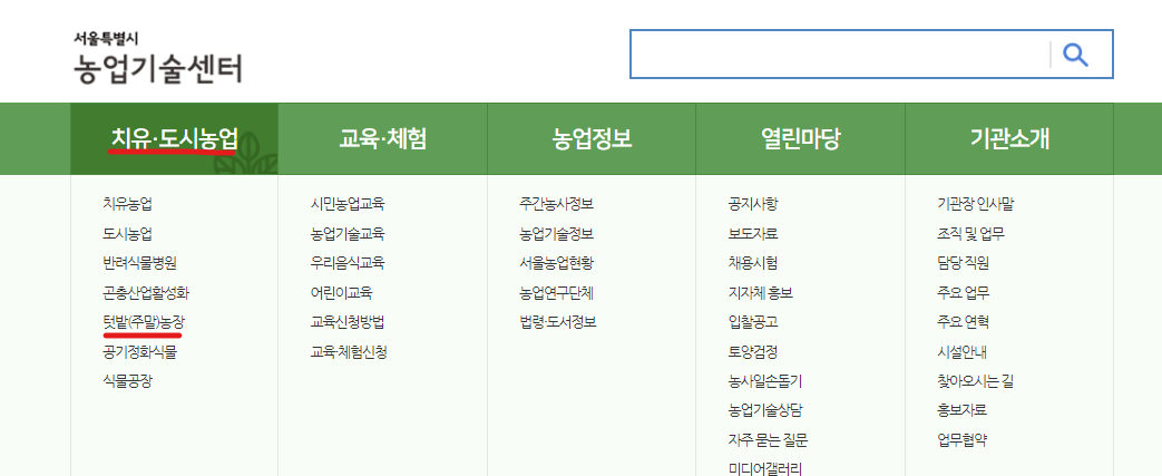 여기서는 서울 주말농장을 기준으로 하여 서울특별시 농업기술센터 홈페이지에서 확인하는 방법에 대해 알아보겠습니다. 아래 순서를 따라하시면 됩니다.