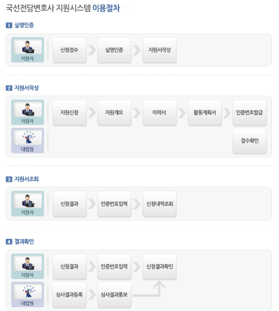 모든 절차가 완료되면 지원서를 작성하며 이력서, 활동계획서 등을 작성하면 인증번호가 발급되고, 신청이 완료됩니다. 이후 신청 결과를 대법원에 통보하면 국선변호사 선임 결과를 확인할 수 있습니다.