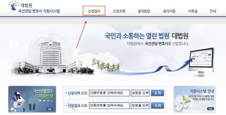 1. 대법원 국선전담변호사지원시스템 홈페이지에 접속합니다.