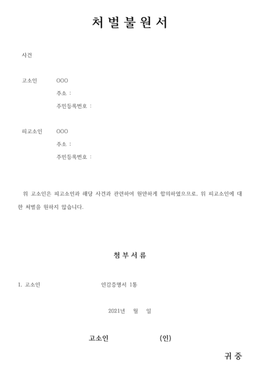 하단에 처벌불원서 파일을 첨부해두었습니다. 폭행 처벌불원서 및 교통사고 처벌불원서 양식으로도 활용가능하니 참고하시길 바랍니다.