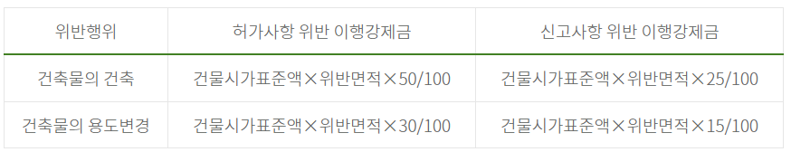 불법건축물 신고가 처리되면 이행강제금과 벌금이 부과되는데요. 이는 불법건축물의 불법 면적에 따라 달라집니다. 자세한 이행강제금 액수는 아래 표를 참고하시길 바랍니다.