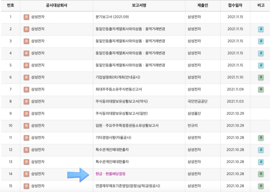 1) 현금/배당 결정 보고서 찾기