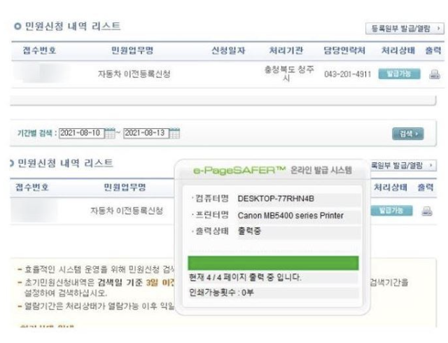 8. 납부 완료 후 납부결과 확인버튼을 클릭하여 확인할 수 있으며, 등록관청 담당 공무원이 이전등록을 완료하여 [민원신청결과] > [민원신청내역]에서 발급가능 옆 프린트 이미지를 클릭하여 자동차 명의이전한 자동차 등록증을 프린터로 출력할 수 있습니다.