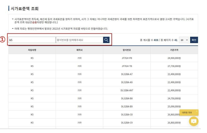 3. 차량을 기입 후 조회를 누르면 기준가격이 나오게 되는데요. 형식번호를 알고 있다면 형식번호를 기입 후 기준가격을 확인해도 되지만 만약 모를 경우는 차량명만으로도 조회가 가능합니다. 다만, 정확한 가격확인을 위해서는 형식번호를 알아야 하기 때문에 애초에 형식번호를 입력 후 조회하시는 것을 추천드립니다.