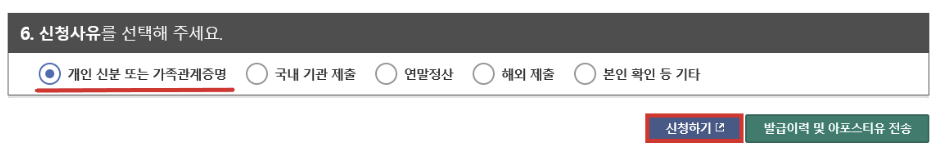 3. 가족관계증명서 발급을 위한 사항을 선택합니다. 총 6가지의 선택사항이 있으며, 용도에 맞게 선택을 하시면 되는데요.