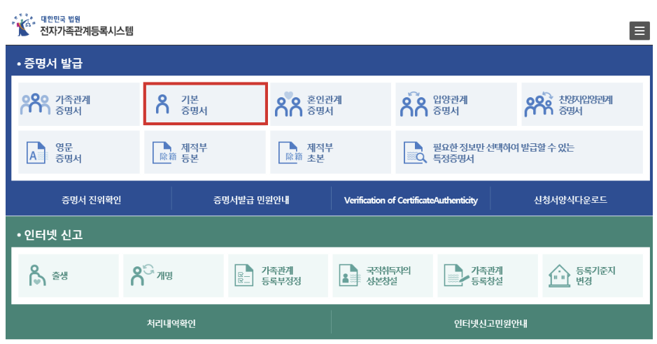 1. 대법원 전자 가족관계 등록시스템 홈페이지에 접속하여 상단 메뉴에 보이는 '기본증명서'를 눌러 주세요.