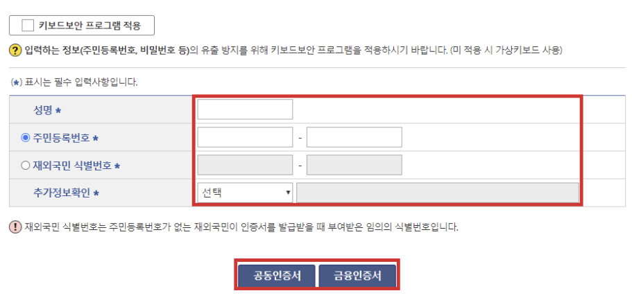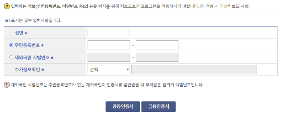 2. 신청인의 본인확인을 위해서 공동인증서 또는 금융인증서로 인증을 해야 합니다. 본인 확인시에는 성명, 주민등록번호, 추가정보 확인의 절차를 거치도록 되어 있습니다.