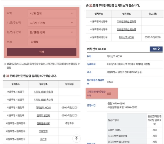 2. 보통 발급기 검색을 할 때 지역, 시, 군, 구 외 위치를 주민센터, 지하철 등등으로 검색하신 후, 조회결과를 보고 여기서 가족관계 발급 여부 확인을 하시고 방문 후 기본증명서 발급을 하실 수 있습니다.
