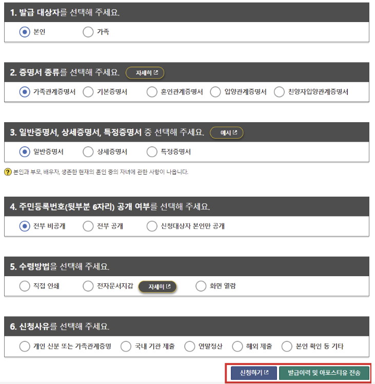 발급 대상자로 본인 또는 가족을 선택 / 증명서 종류로 가족관계증명서를 선택 / 일반증명서, 상세증명서, 특정증명서 중 한 가지를 선택 / 주민등록번호의 공개 여부를 선택 / 수령방법으로 직접 인쇄, 전자문서지갑, 화면 열람을 선택 / 신청사유에서 개인신분 또는 가족관계 증명, 국내기관제출, 연말정산, 해외제출, 본인확인등기타 중 한 가지를 선택합니다.