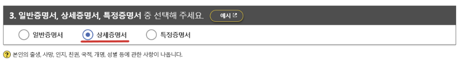 6. [상세 증명서]를 선택해 주세요. 상세 증명서는 출생, 사망, 인지. 친권, 국적, 개명, 성별 등에 관한 사항이 나옵니다.