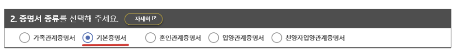 4. 기본증명서 발급대상자 선택은 '미성년자 자녀'를 선택해 주세요