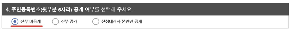 7. 주민등록번호 공개 여부는 제출하는 곳에 문의 후 선택해 주세요. 되도록이면 '전부 비공개'를 선택을 추천드립니다.