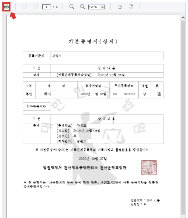 10. 마지막으로 출력 화면에서 좌측 상단에 '인쇄 버튼'을 눌러 주시면 기본증명서(상세) 발급 신청이 완료됩니다.