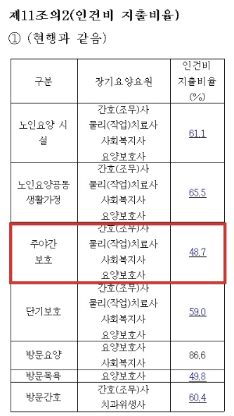 장기요양급여 고시에 따르면, 노인주간보호센터의 직원 직접인건비로 전체 수익에 48.7%를 의무적으로 사용하셔야 합니다. 여기서 직접인건비라 함은 쉽게 말해서 요양보호사, 사회복지사, 물리·작업 치료사, 간호(조무)사의 인건비를 뜻합니다.