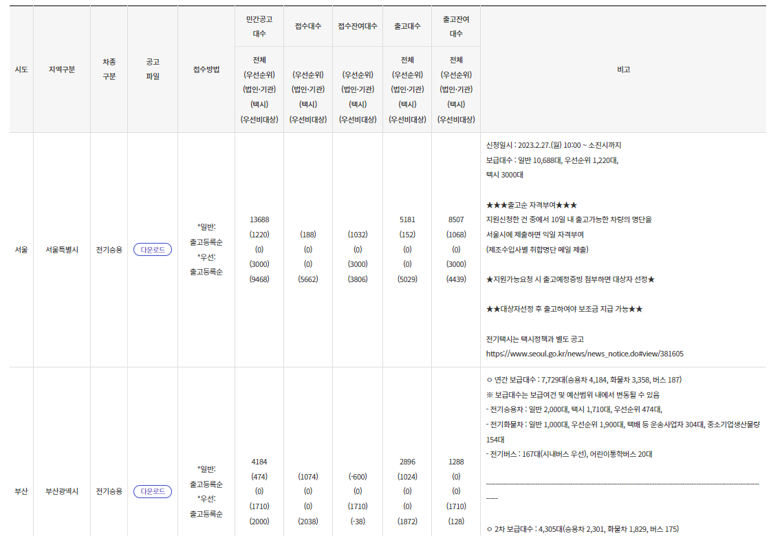 4. 그러면 차종에 맞는 지역별 보조금 공고파일이 나오는데, 공고파일을 다운로드하시면 확인이 가능합니다.