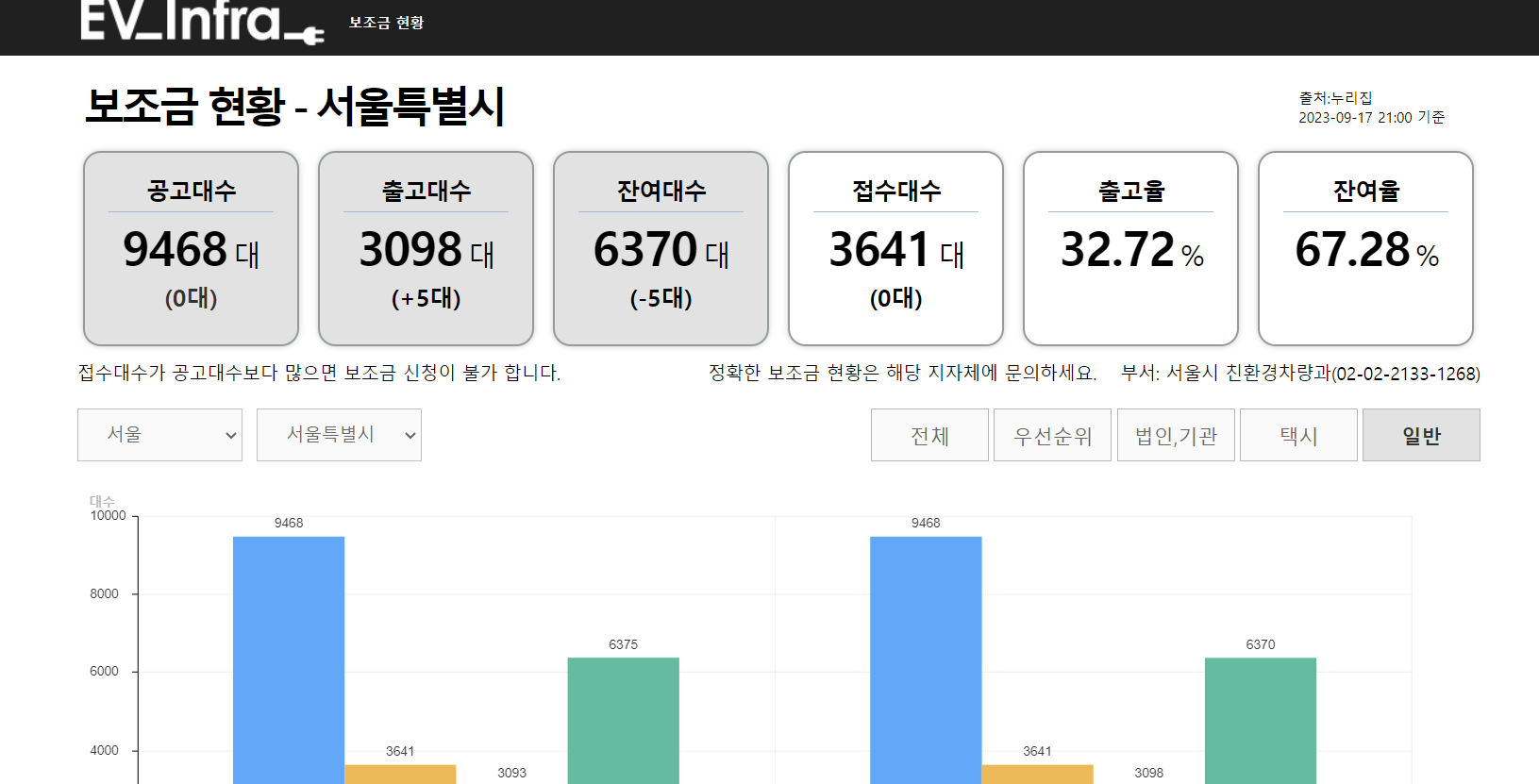 지역별 보조금 현황 뿐만 아니라, 현재 공고대수, 출고대수, 잔여대수 및 접수대수도 확인해볼 수 있는데요. 막대그래프를 통해 출고율을 비교하여 한눈에 보기도 편합니다.
