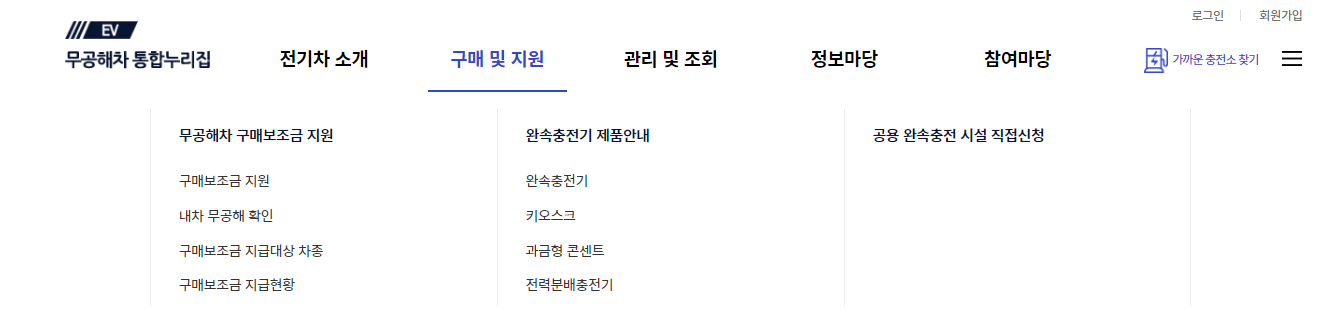 2. 상단 메뉴 중 [구매 및 지원] 클릭, [구매보조금 지급대상 차종] 메뉴를 클릭합니다.