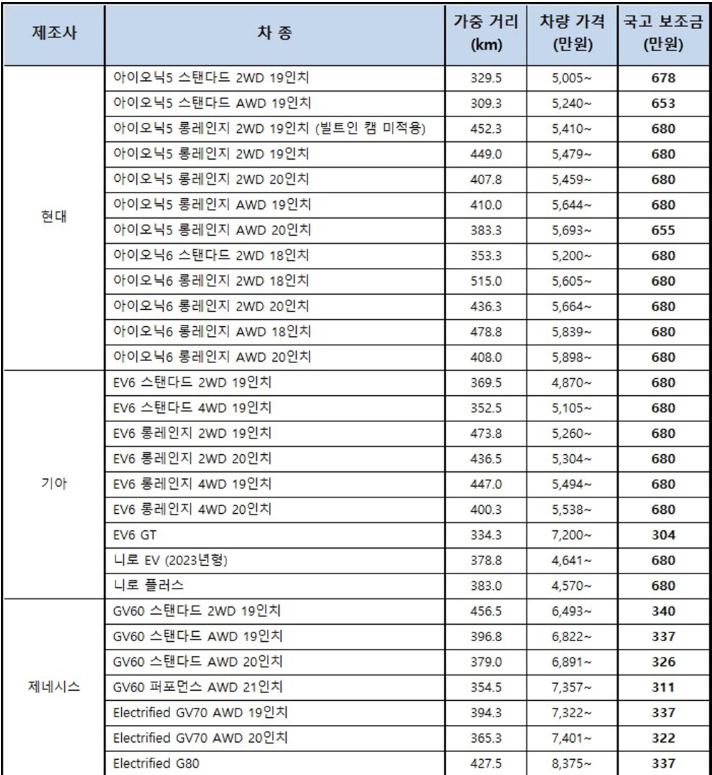 - 차종별 전기차 국고 보조금 2023