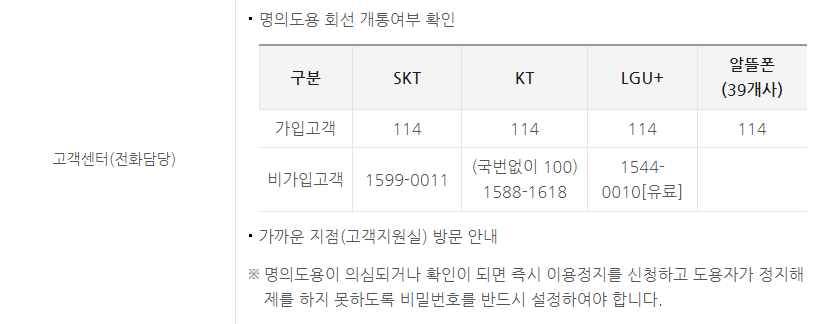 명의도용방지서비스에 가입되어 있지 않는 경우 통신사별로 명의도용 연락처가 달라지는데요.