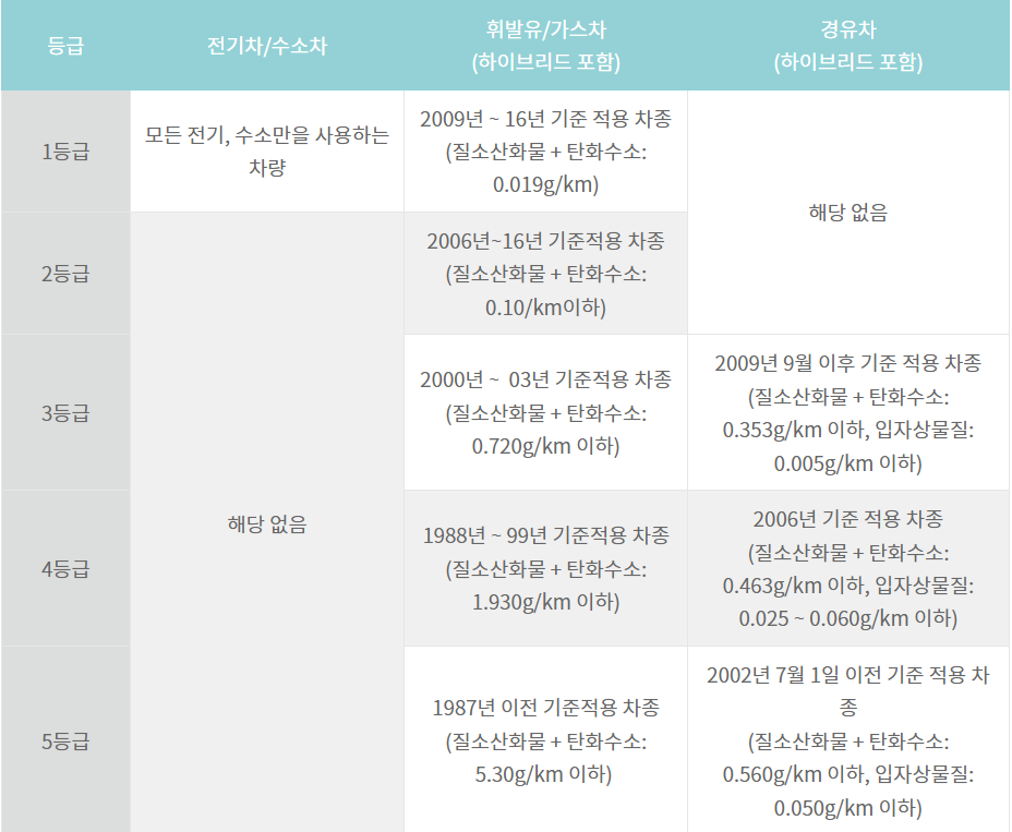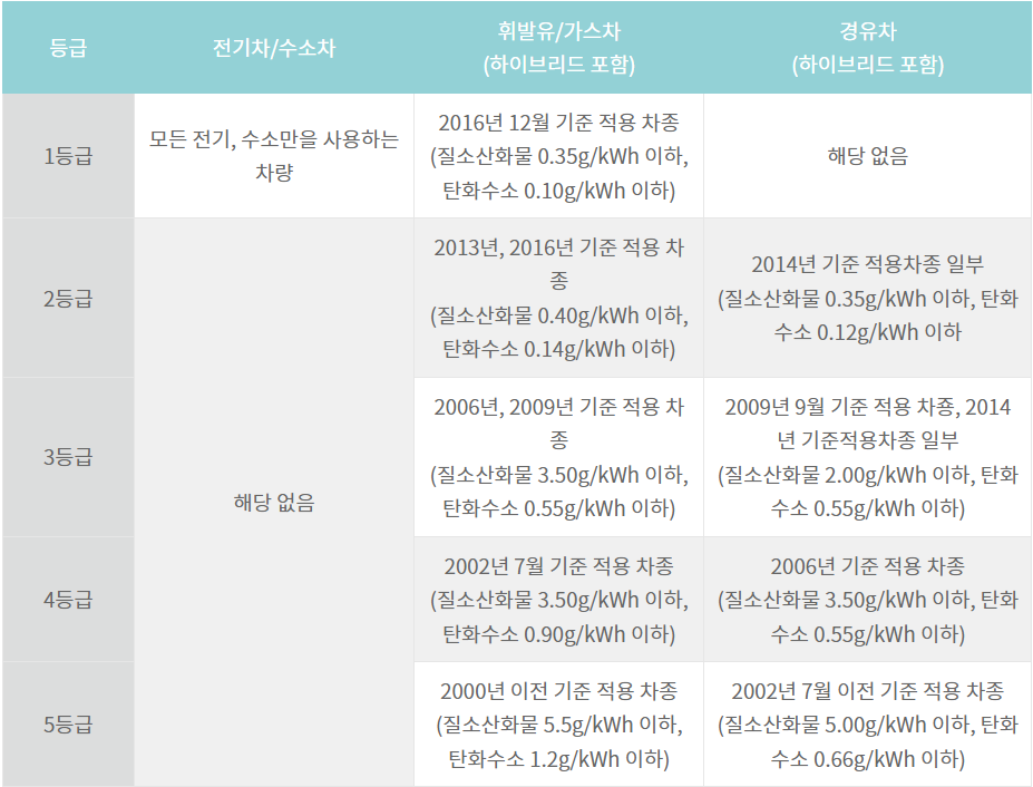 경유차 등급 기준에 대해 알아보겠습니다. 경유차 외에도 전기 및 수소, 휘발유, 가스 차량에 대해서도 다루고 있으니 참고하시길 바랍니다.