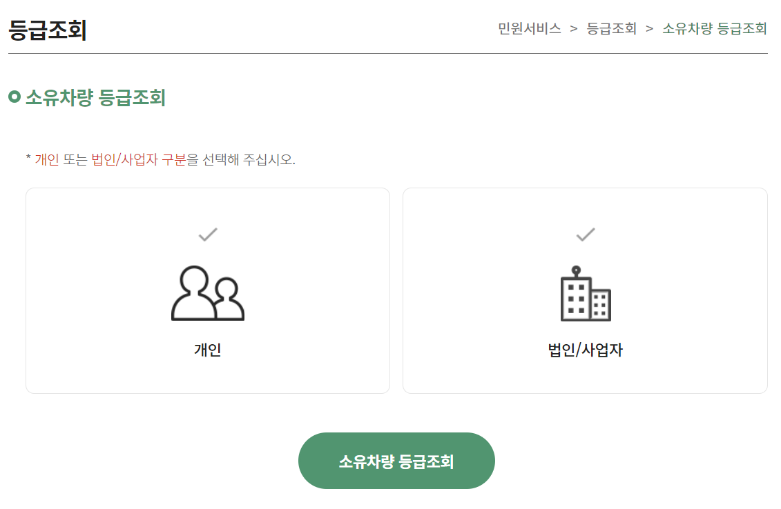 3. 소유차량 등급조회 페이지 내 조회하실 차량의 소유 구분을 선택합니다. 개인 또는 법인/사업자 구분을 선택하신 후 소유차량 등급조회 버튼을 클릭해 주시면 됩니다.